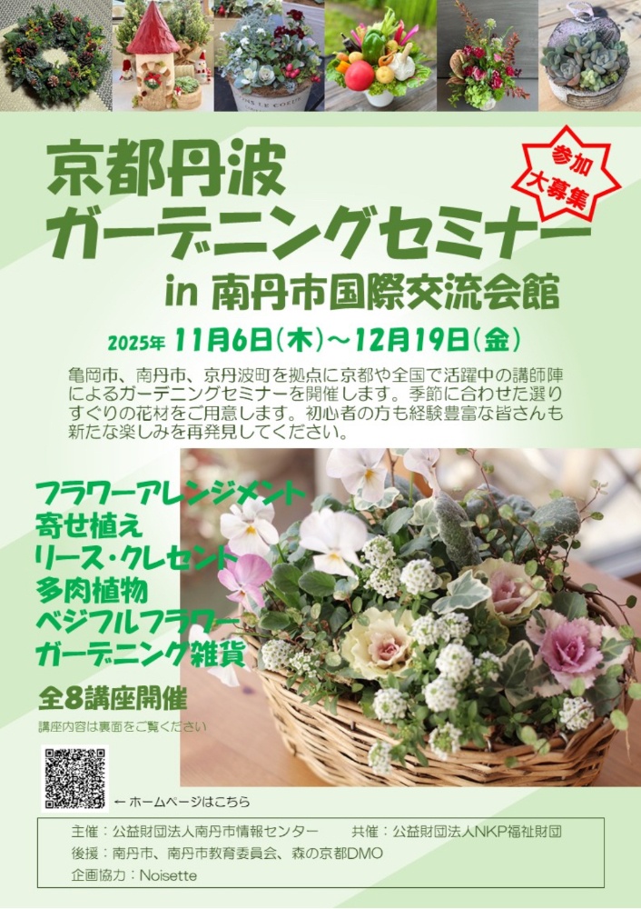 亀岡市、南丹市、京丹波町を拠点に、京都や全国で活躍中の講師陣によるフラワーセミナーです。全講座8講座詳細は、公益財団法人南丹市情報センター様のホームページに掲載されています。お申込みは、南丹市情報センター様まで。0771631777(HP内に申し込みフォーム有ります。)プレフェール花実は、2講座に講師参加いたします。🟢11月6日(木)13時〜 Xmasリース クレセント🟢12月19日(金)13時〜 Xmas テーブルリース